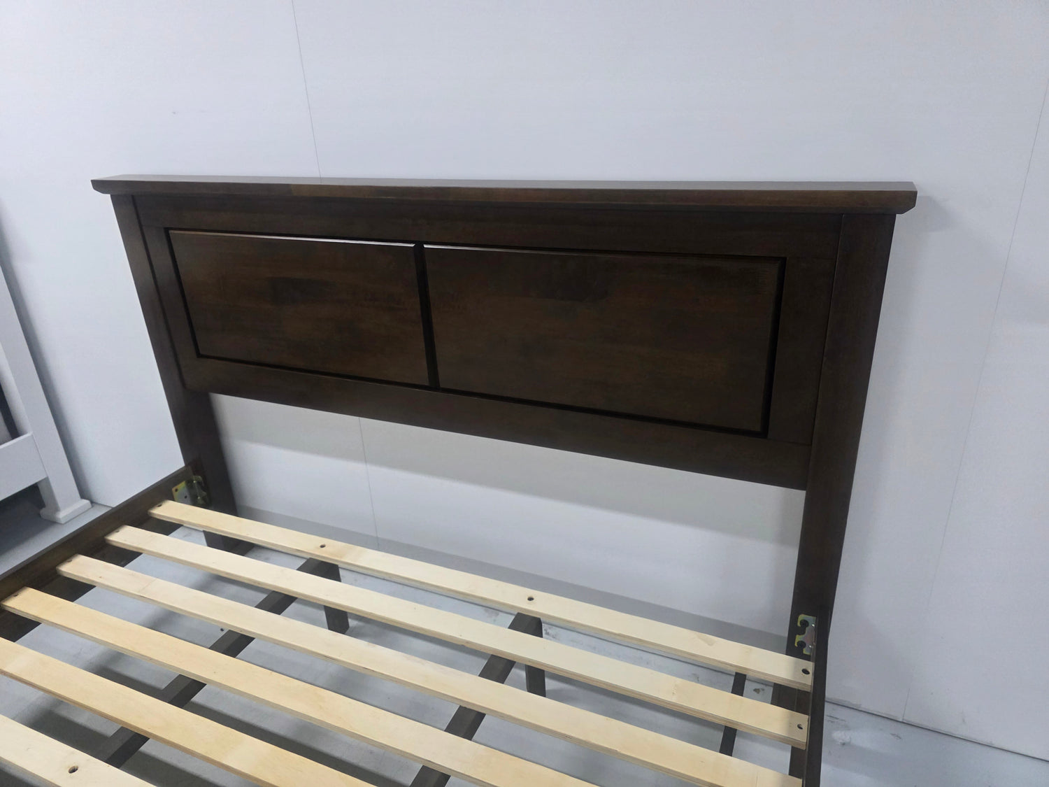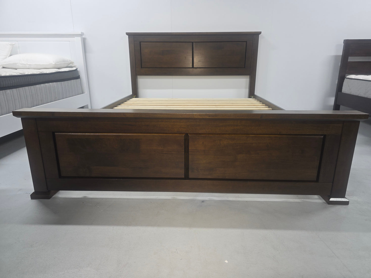 This bed showcases gorgeous timberwork, with the modern style, top rail and legs and a striking footboard. Experience the pleasure of true, rich brown timber in your own home. Solid timber with a flat timber slat base and 2 centre rails.