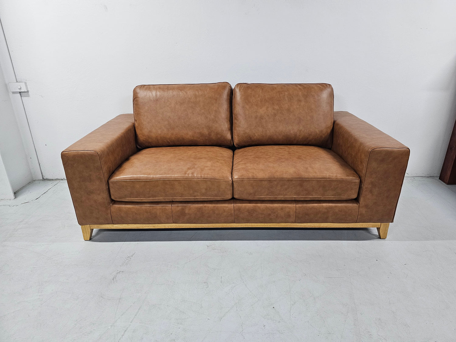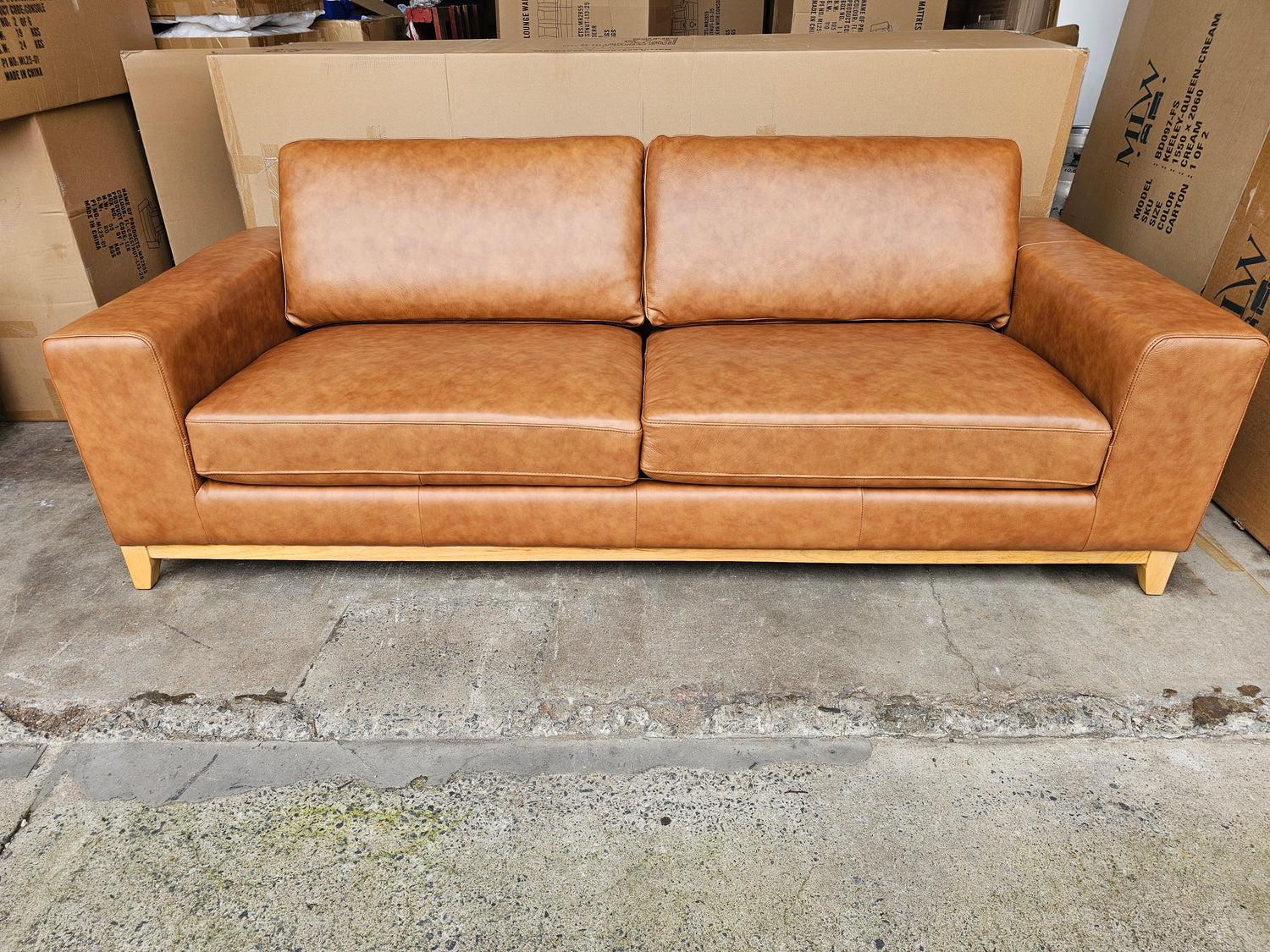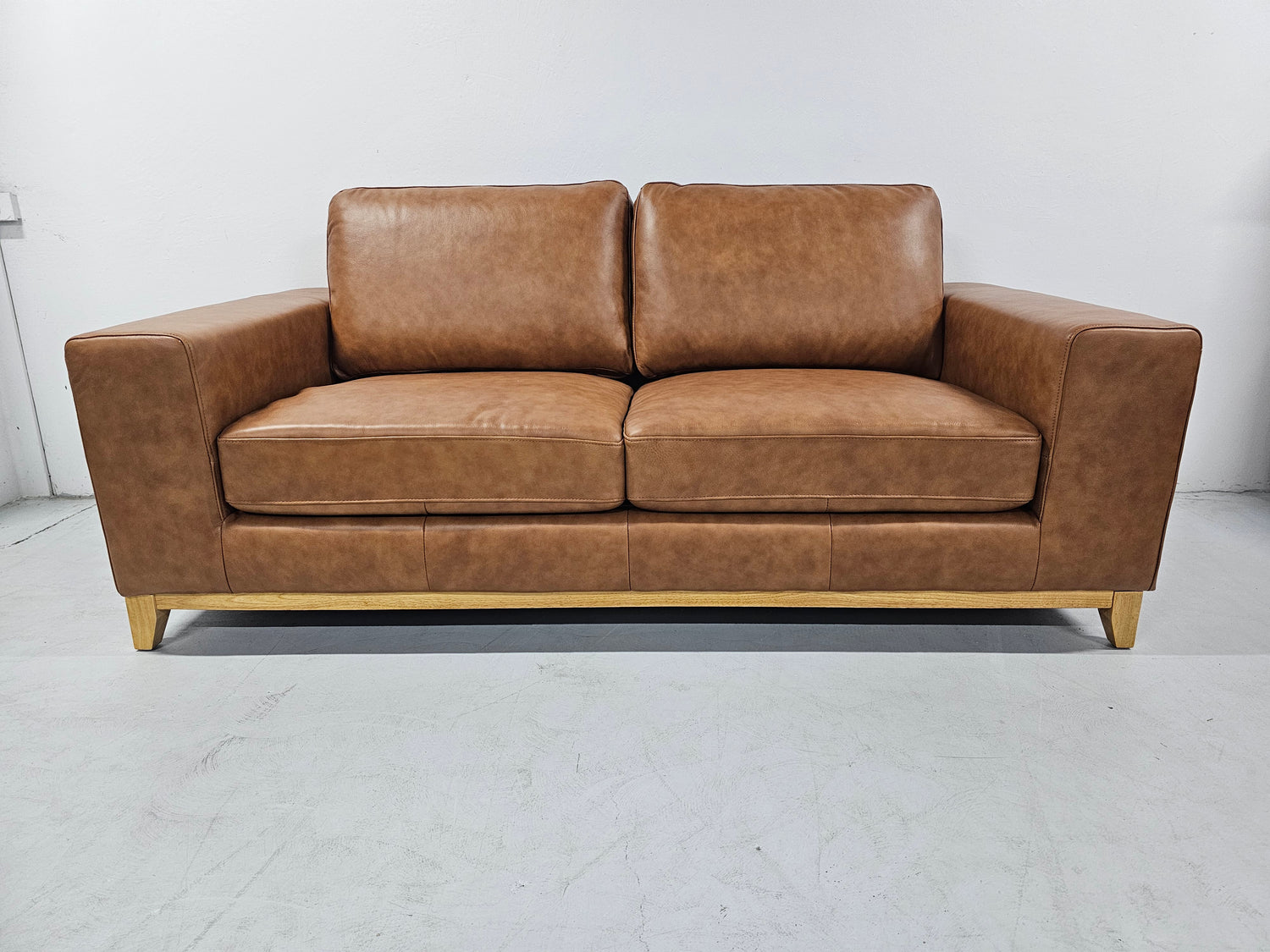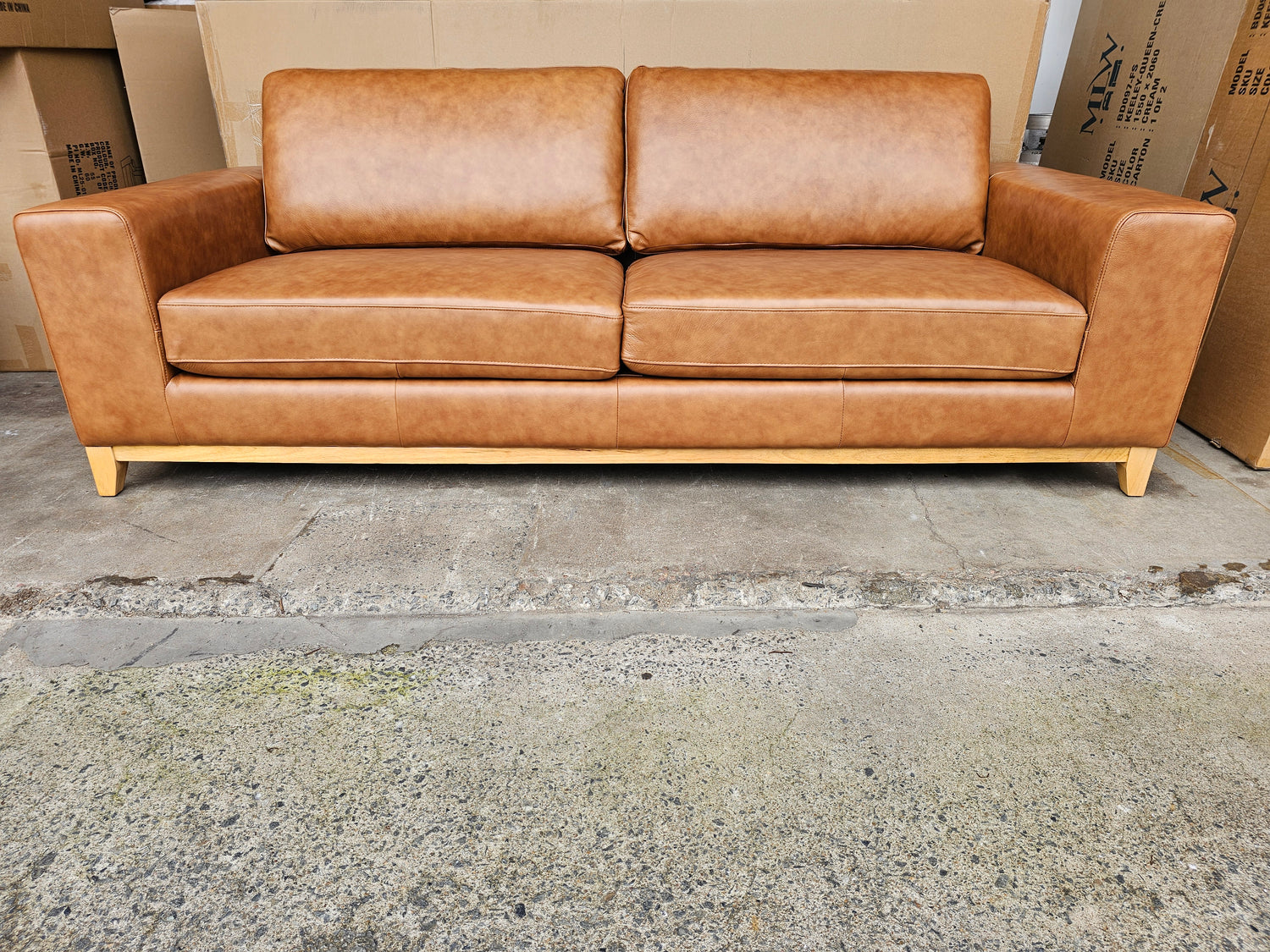 The Bliss leather sofa is available in Tan Leather and has natural timber legs.