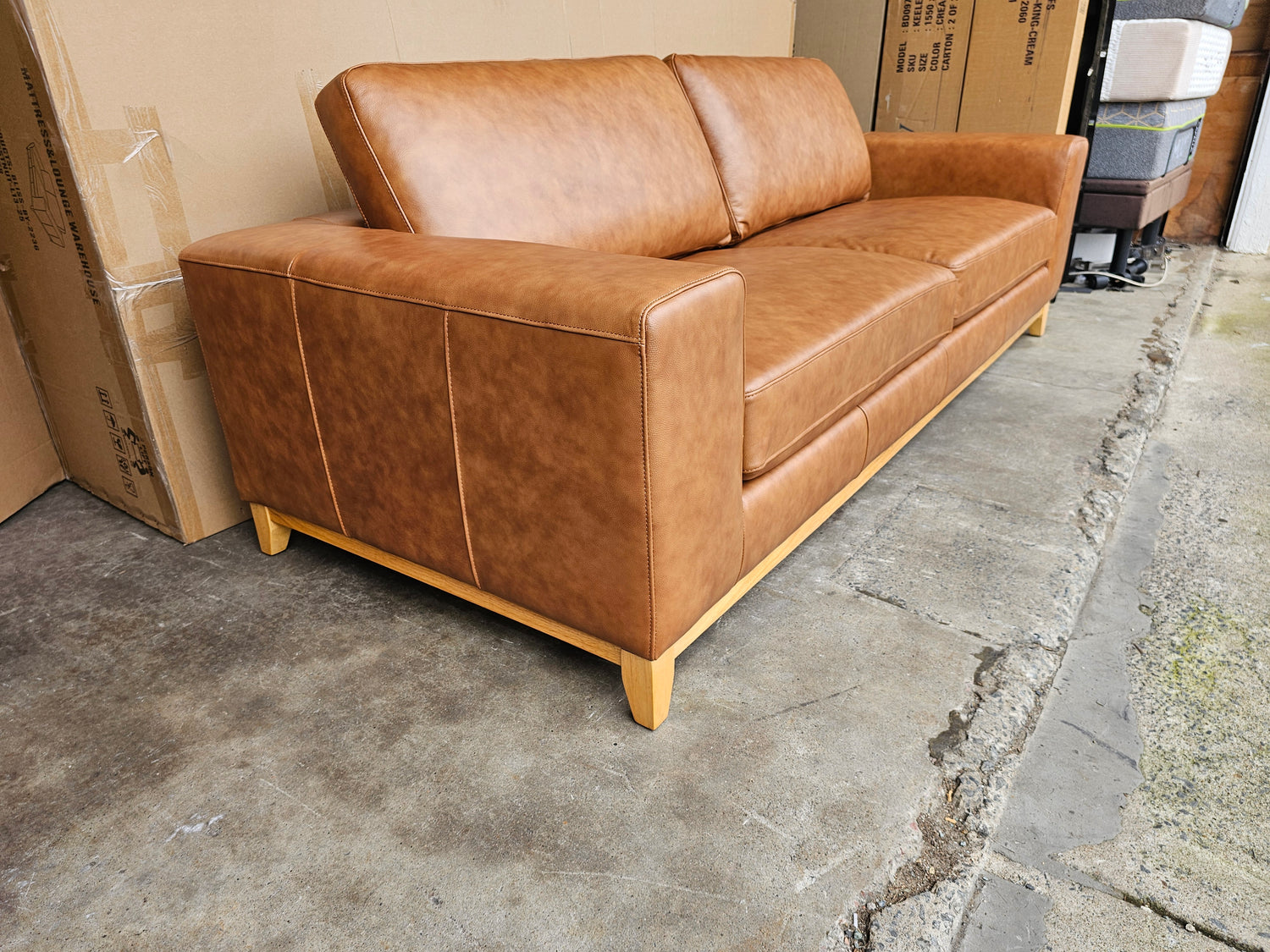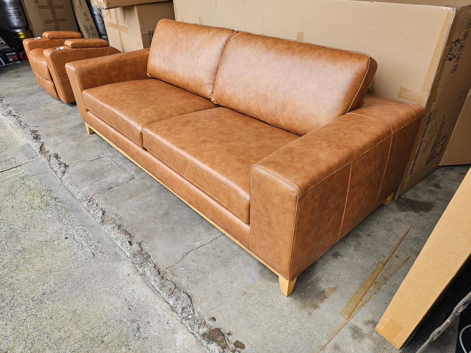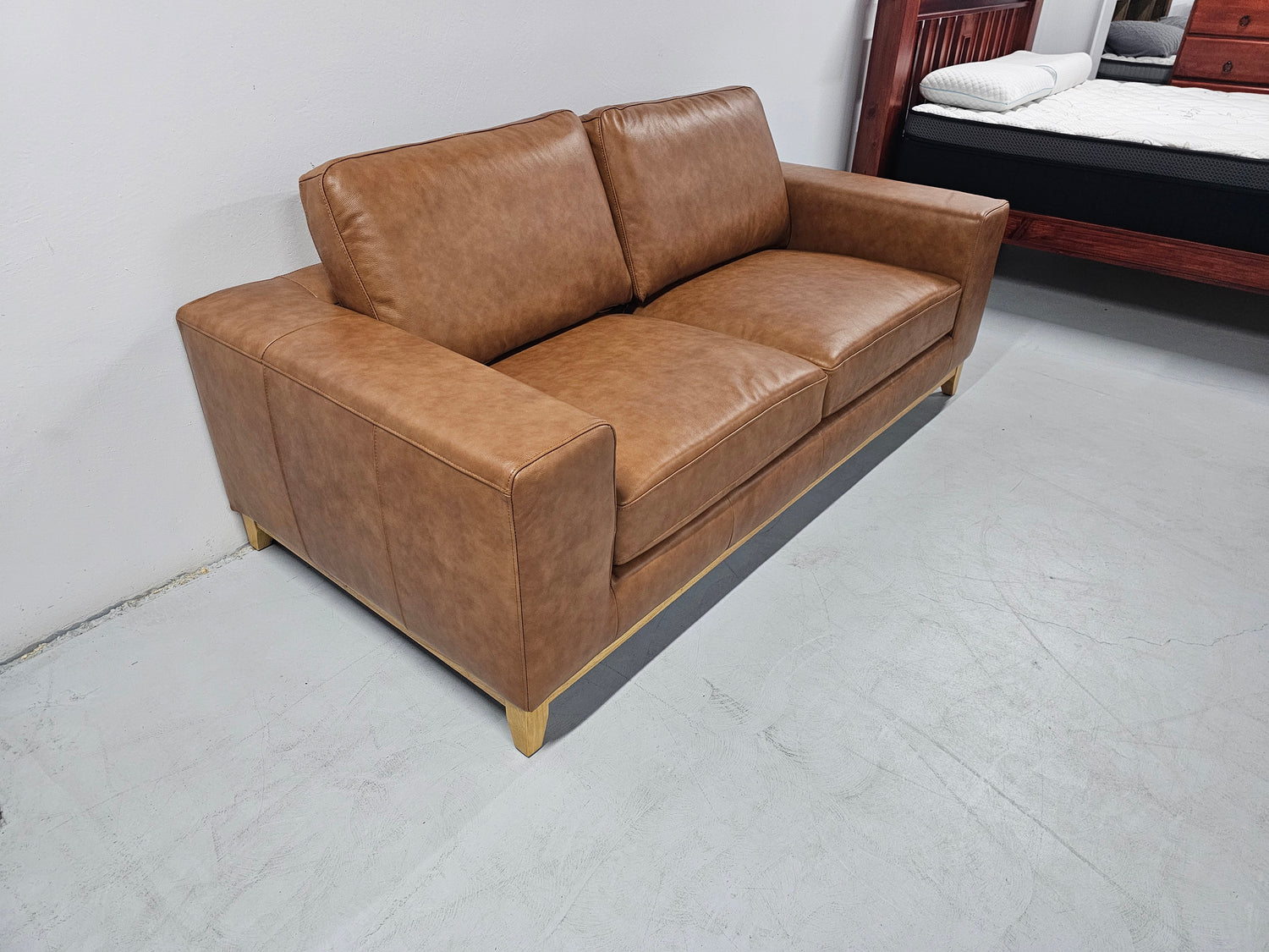 The Bliss leather sofa is available in Tan Leather and has natural timber legs.