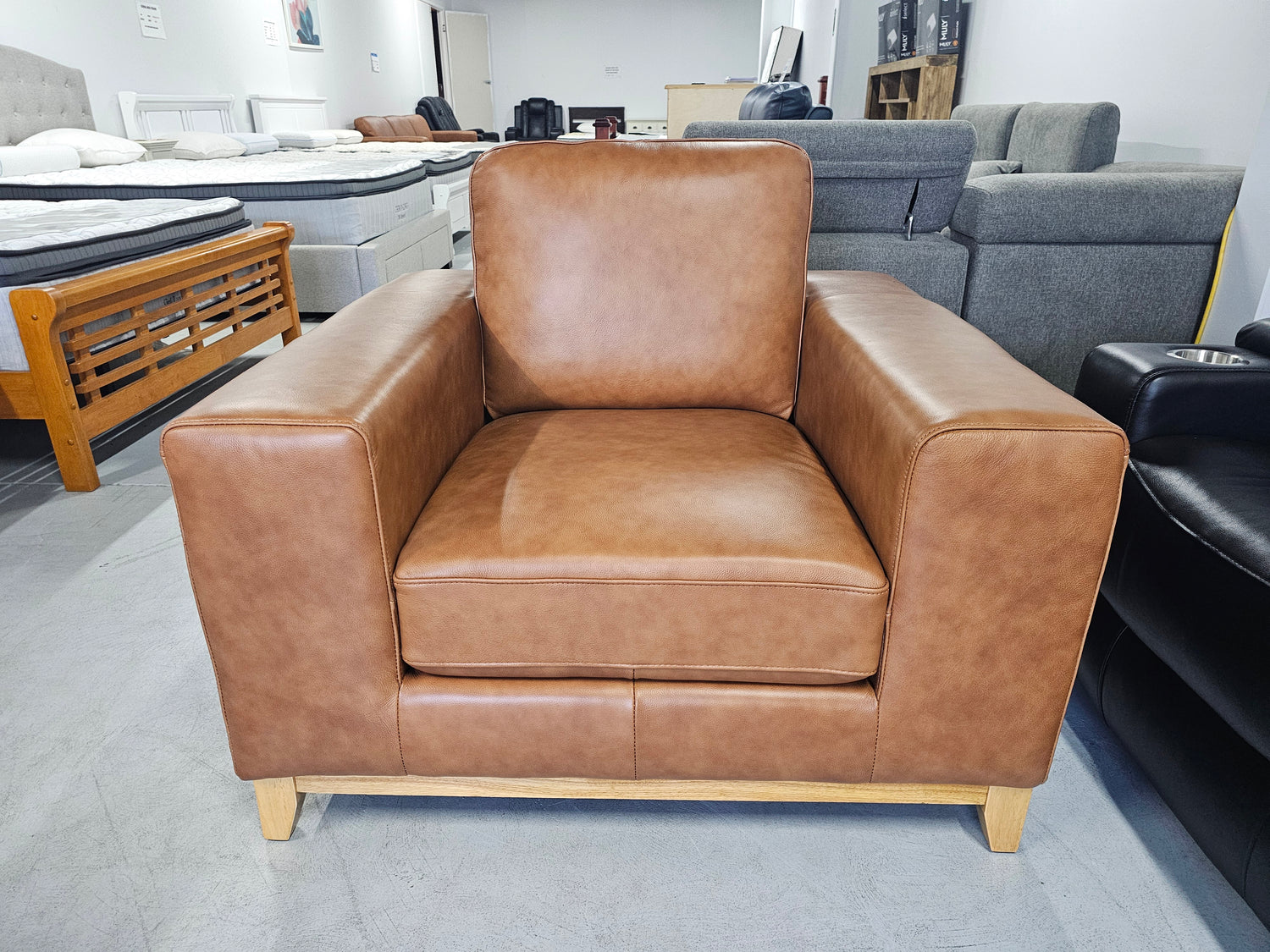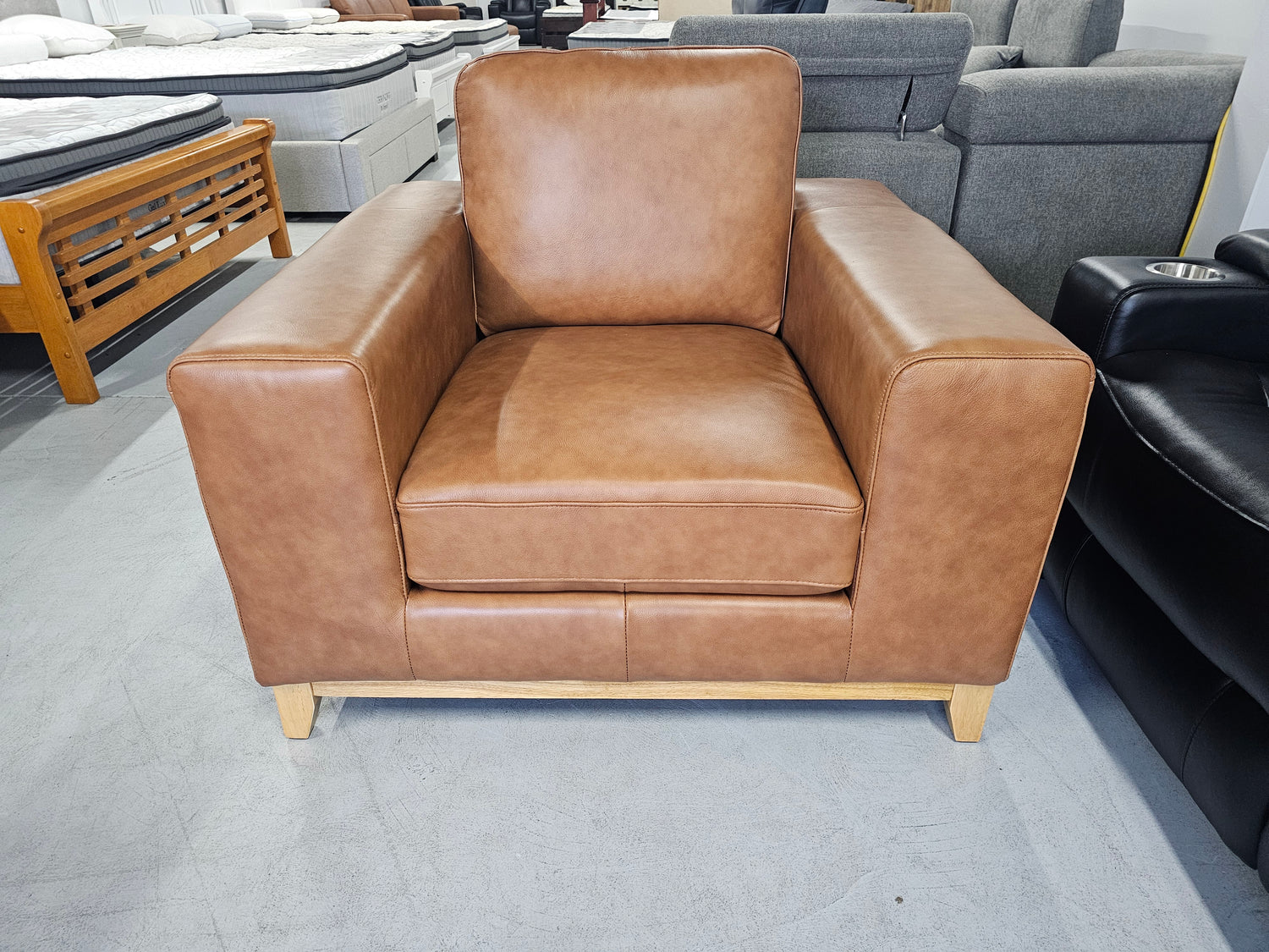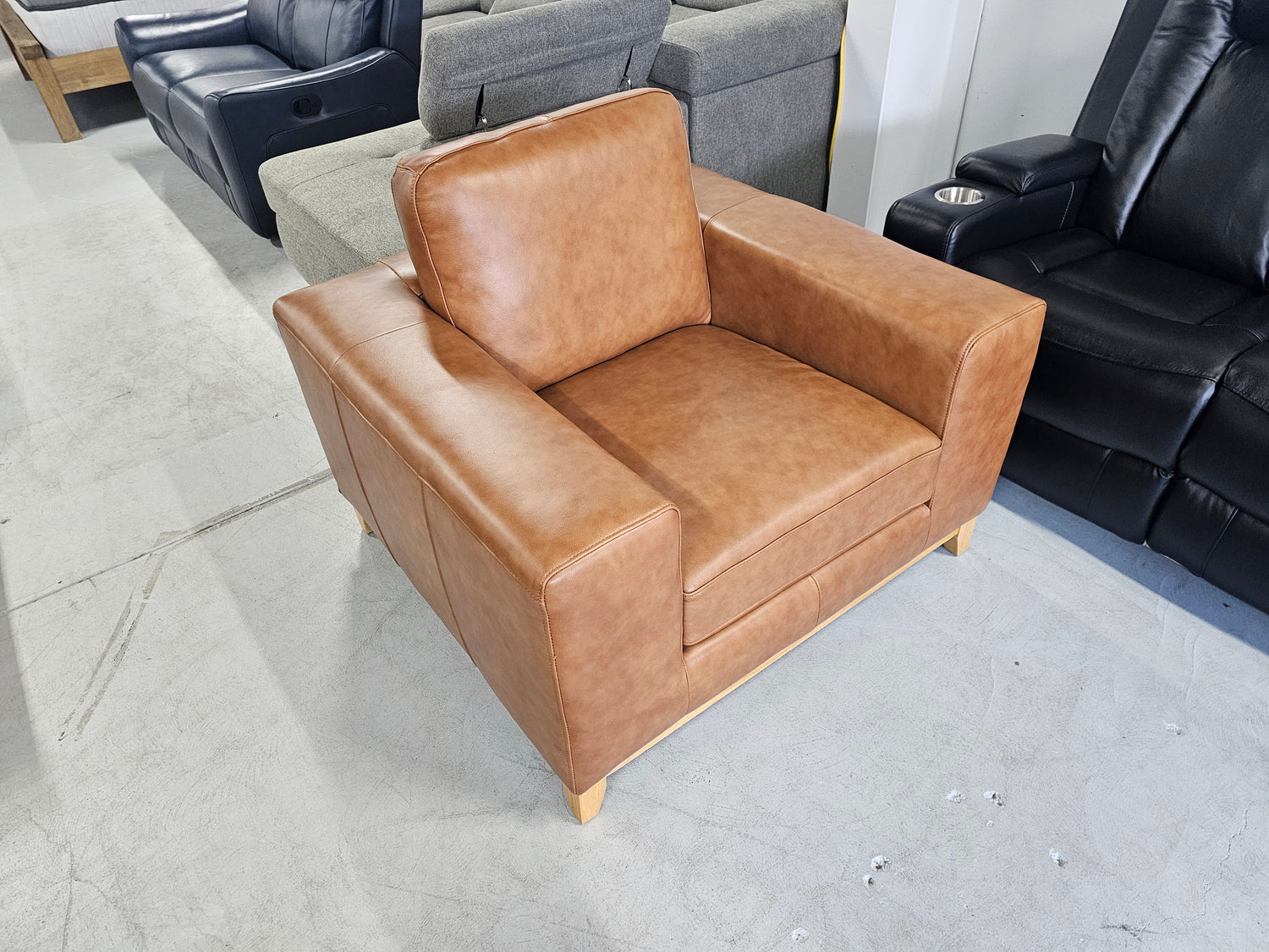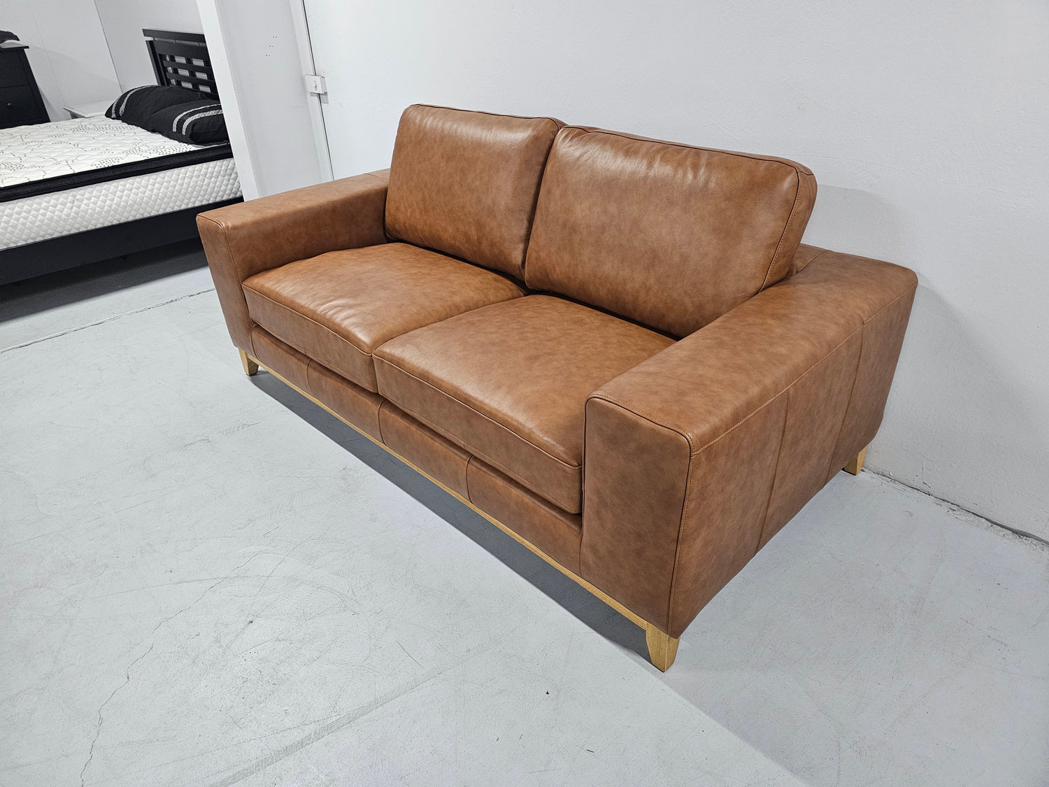 The Bliss leather sofa is available in Tan Leather and has natural timber legs.