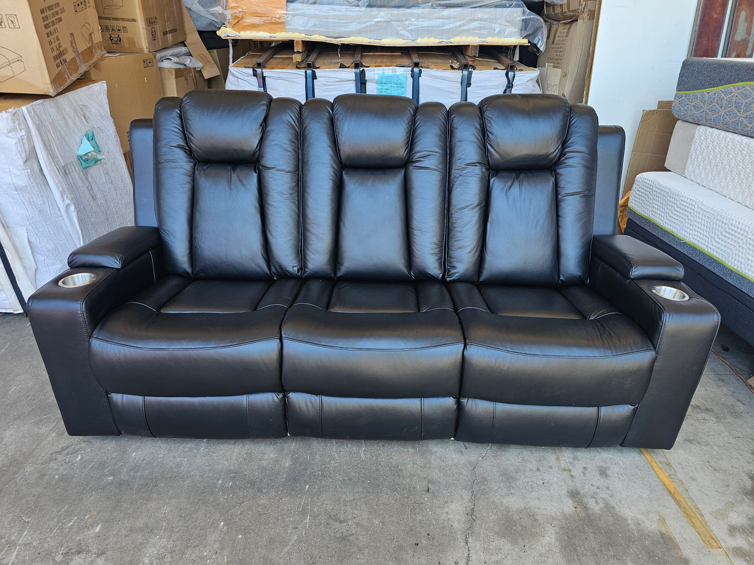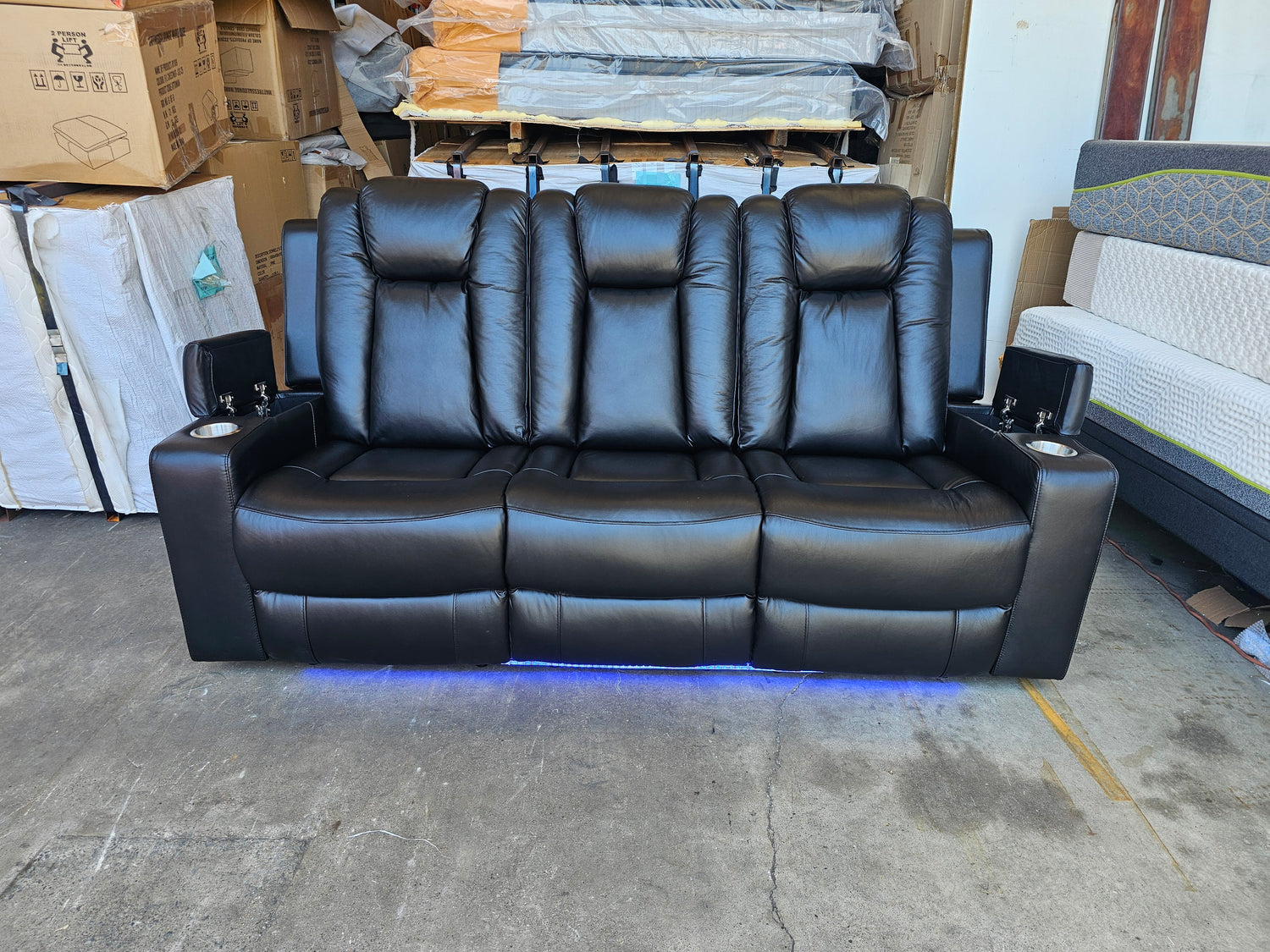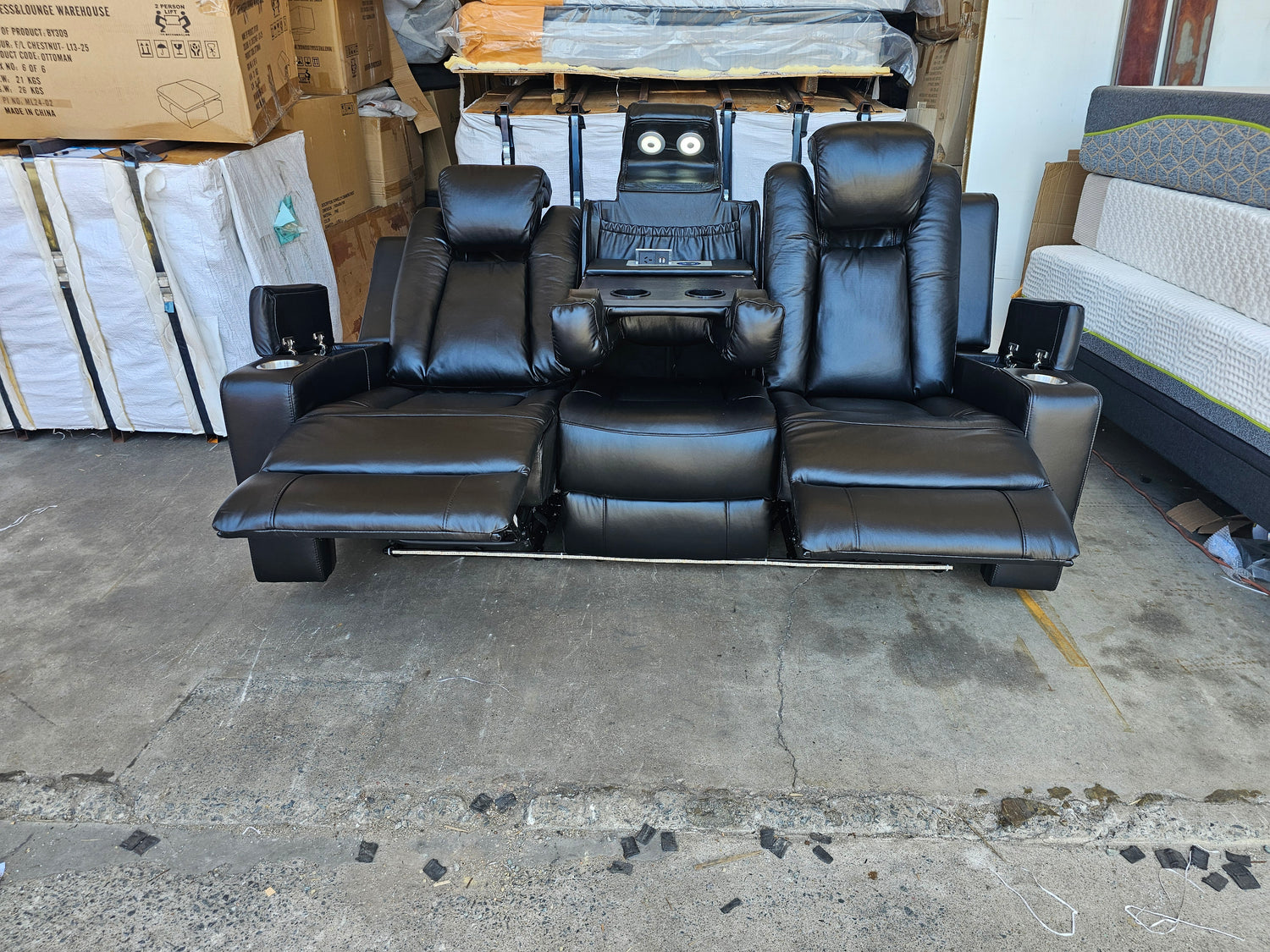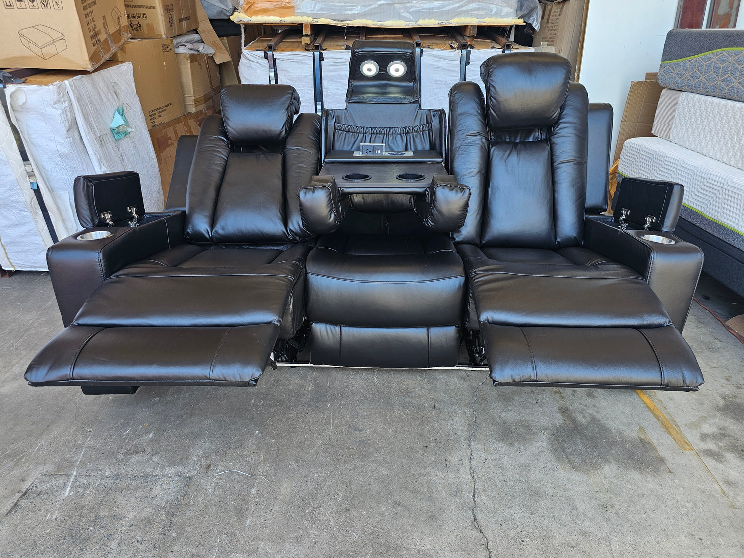 The Byron leather home theatre lounge is both modern and traditional. It is super comfortable with all the modern extras. It has both USB A and USB C charging ports, cup holders, storage compartments, lights, electric recliners, electric head rests and is 100% Leather everywhere.