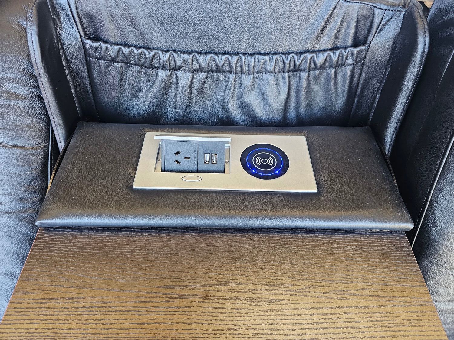 The 3 seat has a drop down tray with cup holders, charging ports, a wireless charging station, a 240v plug and reading lights.
