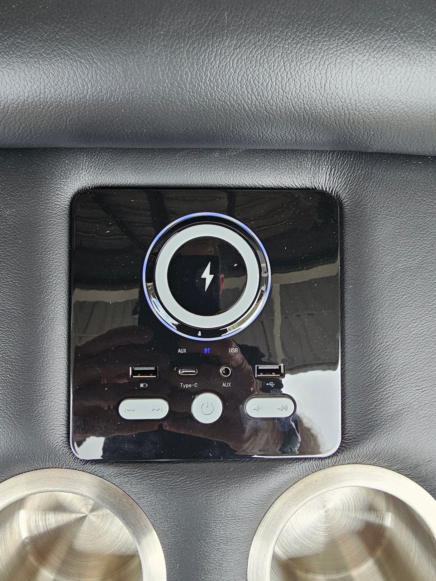 The 2 seat with console has a wireless charging station, charging ports and speakers.